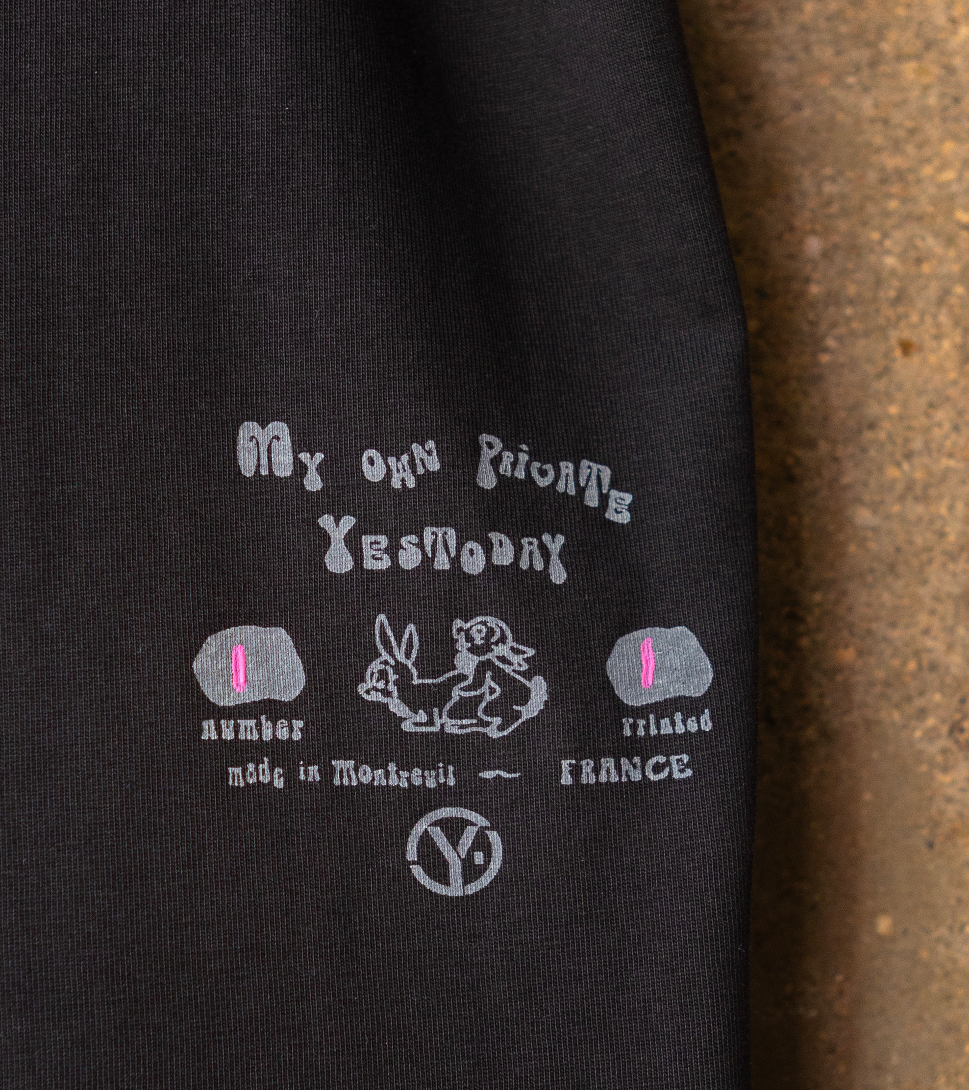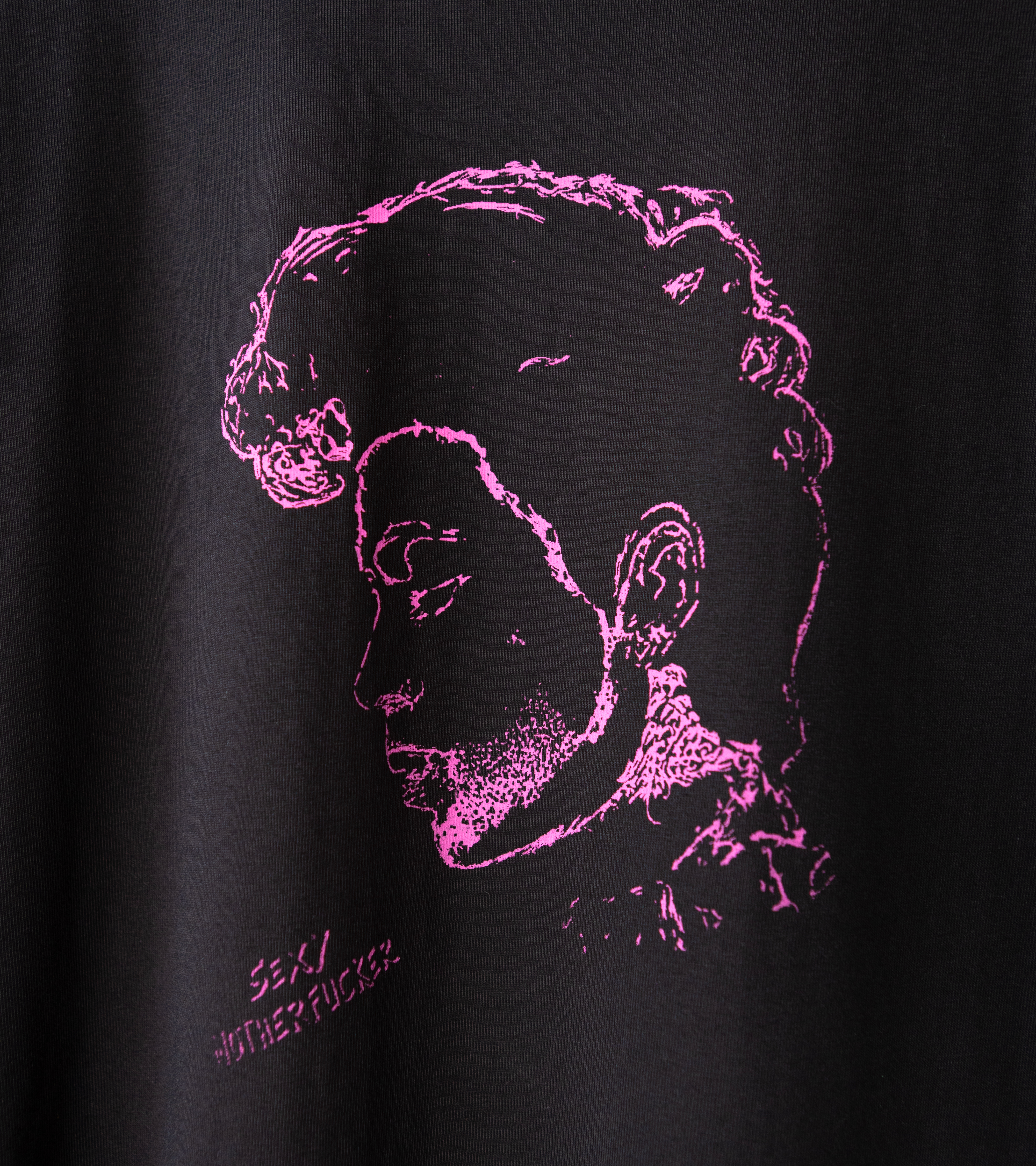 Sérigraphie rose magenta sur T-shirt noir stone-washed.