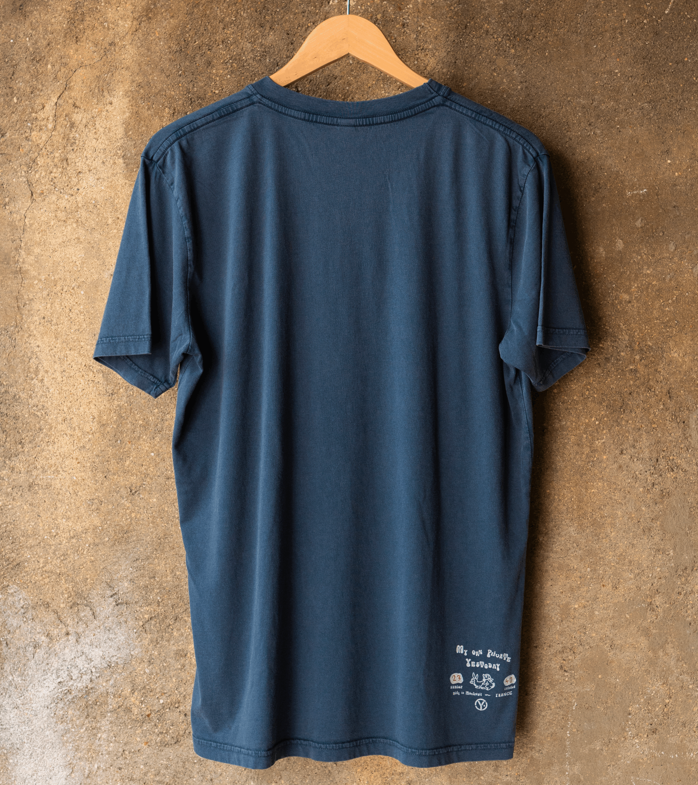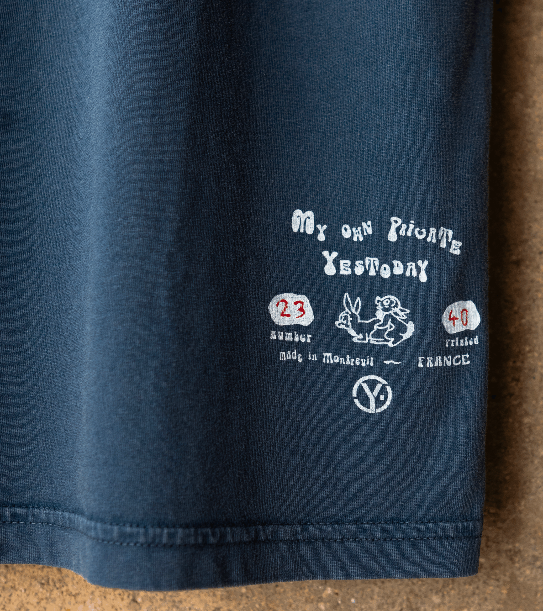 Chaque T-shirt est sérigraphié à l’avant en bicolore, rouge et jaune et numéroté à la main à l’arrière du T-shirt bleu stone-washed sur notre célèbre étiquette.