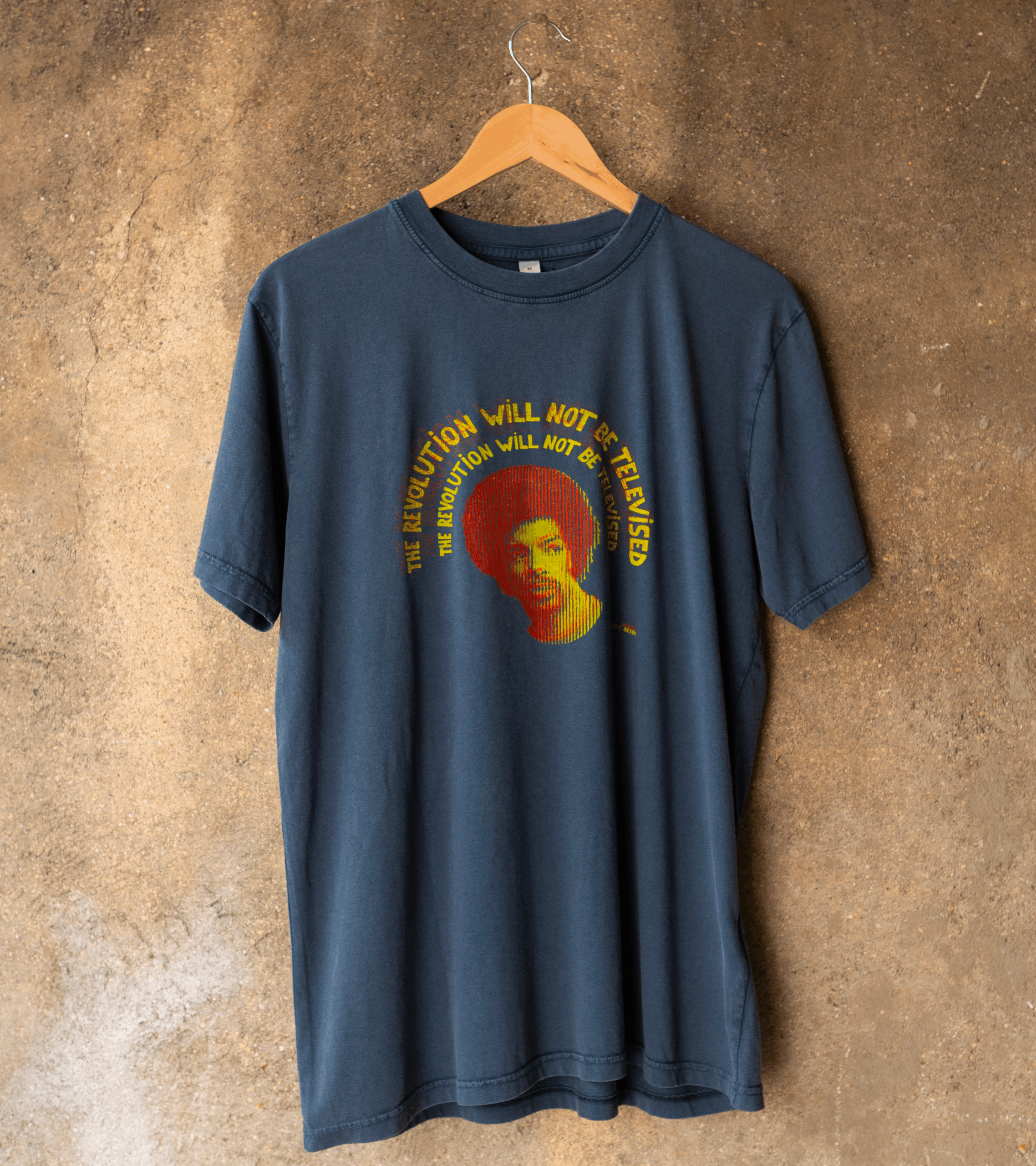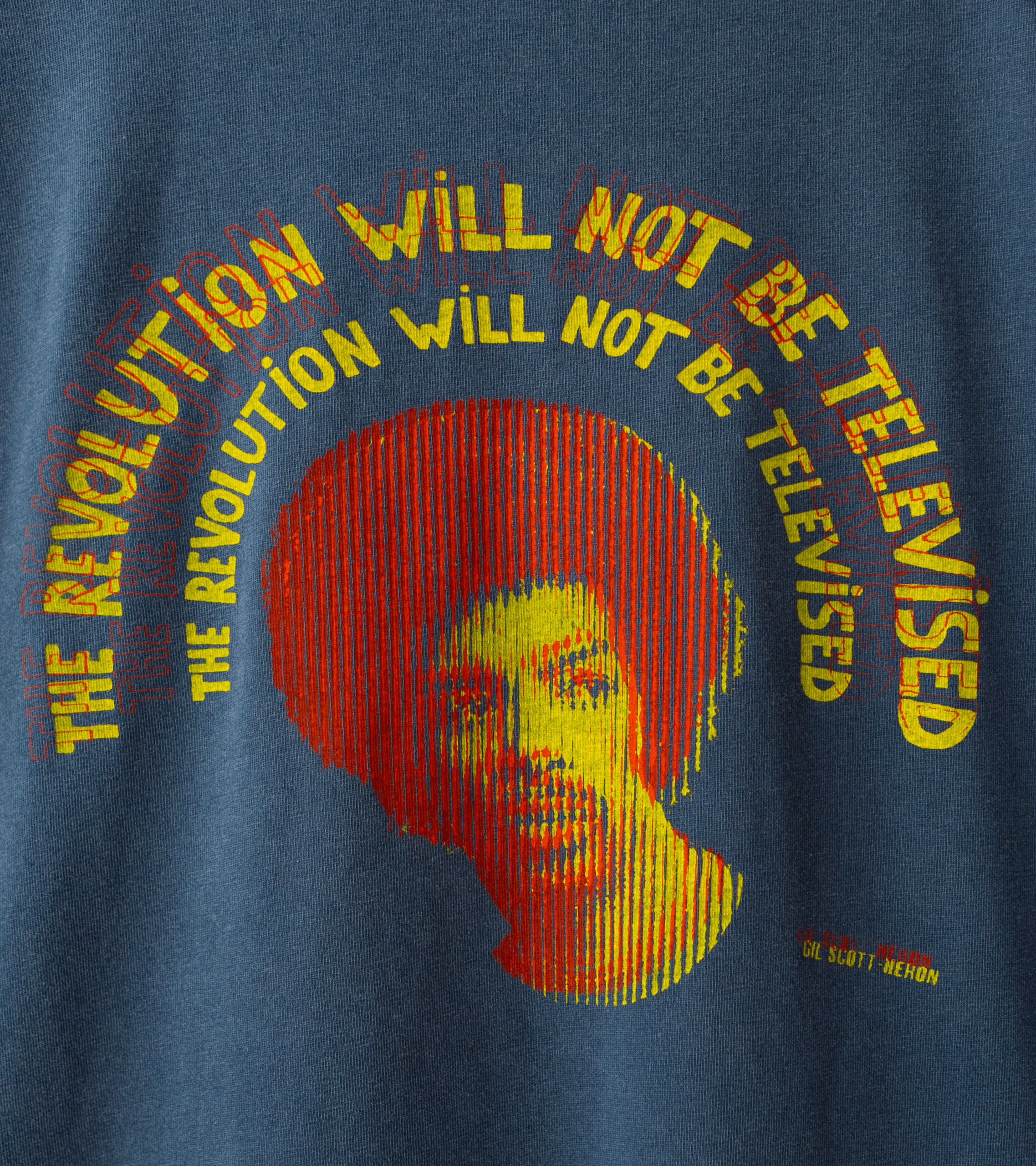 Ce T-shirt est un hommage à l’écrivain-poète-musicien noir Gil Scott-Heron et à l’un de ses morceaux soul cultes, The Revolution will not be televised, enregistré en 1971 chez RCA.